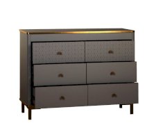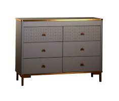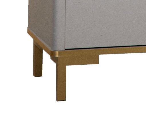 Корпус и фасады комода изготавливается в ЛДСП цвета Серый. Кромка, ручки и опоры золотого цвета. В сочетании с золотом серые тона выглядят не скучно, а золото приобретает благородный оттенок, что в итоге дает изысканное и утонченное сочетание.