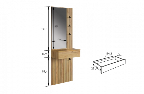 Крючки предоставляют удобное место для хранения сумок или аксессуаров. Выкатной ящик служит дополнительным пространством для хранения мелочей, таких как ключи, кошелек, косметика или другие небольшие предметы.