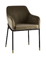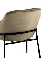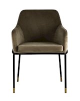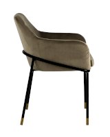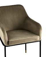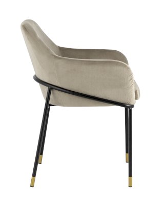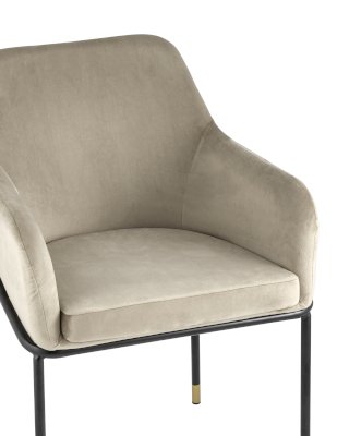 Стул с эргономичной посадкой, мягким сиденьем и широкой удобной спинкой и мягкими подлокотниками. Каркас и ножки черного матового цвета изготовлены из прочного металла с золотым декором, обивка из велюра - износостойкого материала с приятной на ощупь структурой.