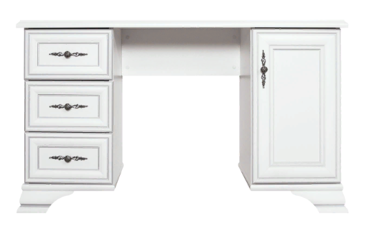 Туалетный стол Кентаки – удобная, красивая и высокофункциональная мебель, позволяющая обустроить стильный и комфортный интерьер в классическом стиле. Прекрасное решение для хранения косметики. Три выдвижных ящика и большое отделение на распашной двери предоставляют достаточно места, где можно разместить все необходимое. Также стол можно использовать как традиционный письменный.