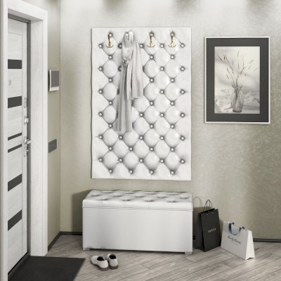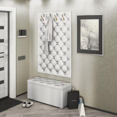 Мягкая стеновая панель с крючками для верхней одежды, выполненная с настоящей каретной стяжкой.