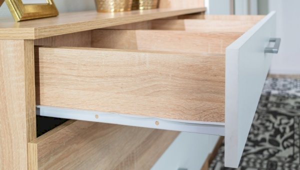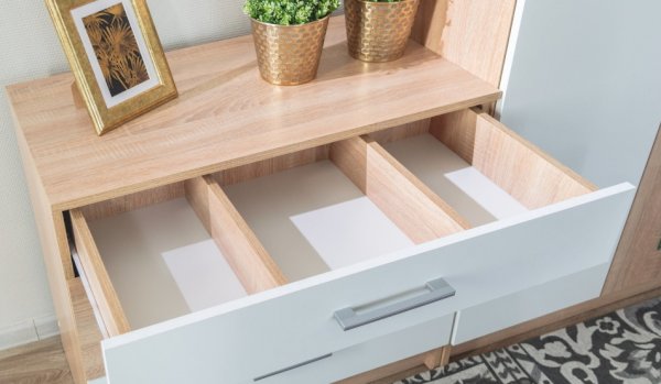 Особенности: верхний ящик комода разделен на три части для оптимизации хранения мелких предметов