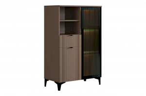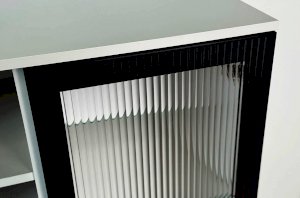 Дизайн комода продуман до мелочей: с одной стороны расположена стеклянная дверца, за которой находится просторное пространство для хранения. С другой стороны – ниша с открытой полкой, выкатной ящик и ещё одна глухая дверца, что позволяет гибко организовать хранение и поддерживать порядок в доме.